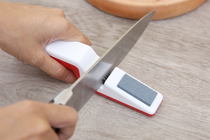 - Bước 2: Sau đó, đặt lưỡi dao vào rãnh mài sắc, kéo lưỡi dao từ trước ra sau (3 đến 5 lần) để mài mịn dao, kéo sắc bén hơn.